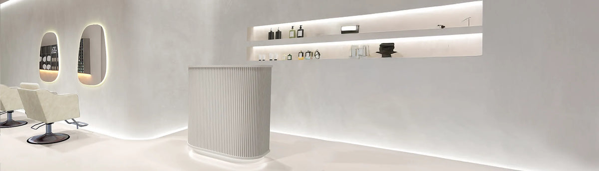 第一印象でもあるレセプションカウンターは美容室にとって重要なアイテムの一つでもあり、サロンインテリアそのものを大きく担う存在です。マテリの美容室専用・サロン カウンターは、コンテンポラリーな雰囲気のルーバー装飾やモールディングデザイン、シンプル・モダン・ナチュラル・モノトーンインテリアなど様々な美容室 内装に対応。レジカウンター、美容室 受付として、また事務的な作業台としての店舗カウンターはサロンワークの補佐役となります。美容室 レジカウンターの作業動線を考慮された便利な機能を詰め込んだサロン仕様にピッタリのアイテム。レジカウンター サロンのことを知り尽くした機能とデザインで、受付カウンター 美容室の空間を彩ります。