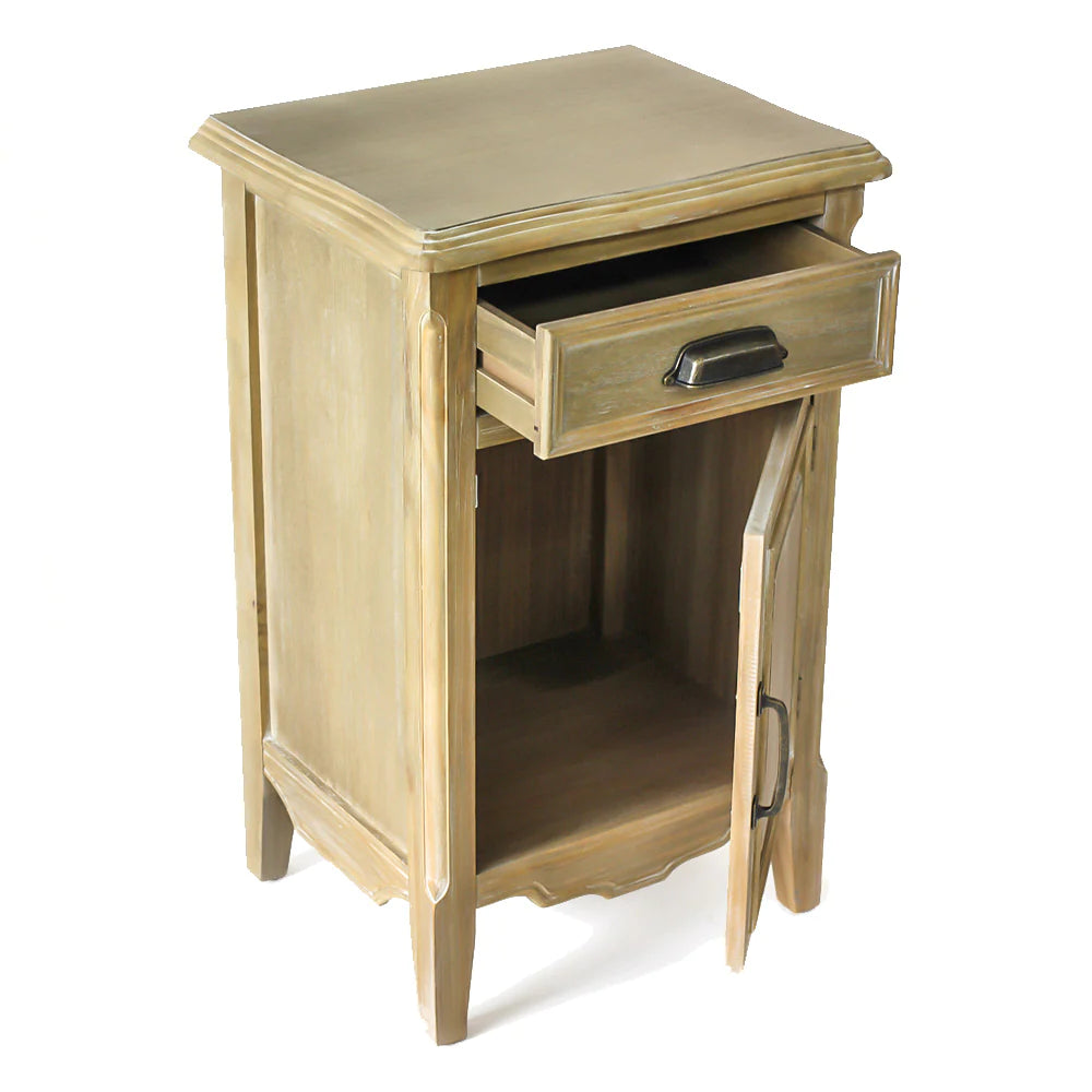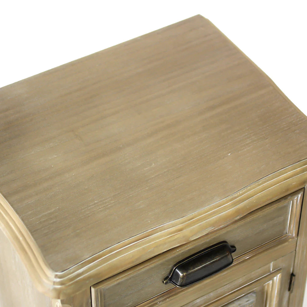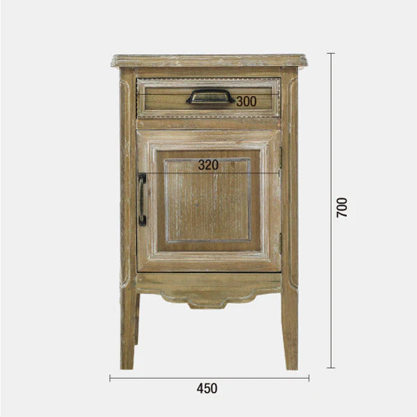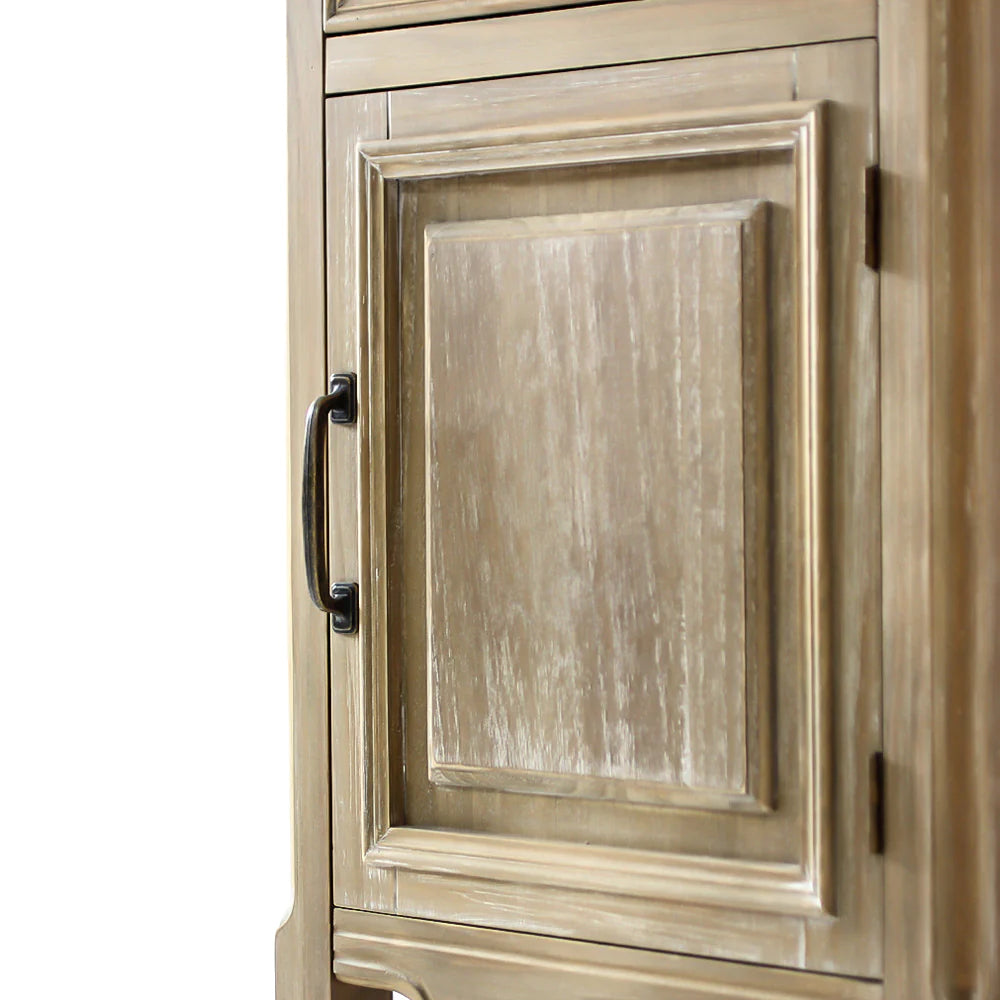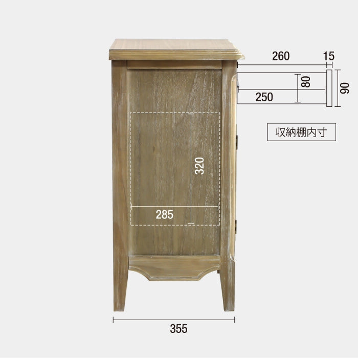 木部は彫刻やモールディングを施したエイジング仕上げ、取っ手はクラシカルなアイアンパーツで、味わいある空間を演出します。