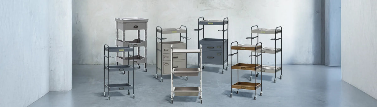 美容室をはじめ様々なサロンにフィットする実用性の高いワゴン。サロンワークのために考慮された、使い勝手抜群の収納や引き出しが充実したウッドワゴンです。加えて「ベージュ系」「モノトーンインテリア」とも相性のいいシンプルなステンレスワゴンを展開。美容室 ワゴンとして便利な機能を兼ね備え、カットチェアや他の家具との相性もいいおしゃれなアイテムです。多岐にわたるサロンインテリアにも対応できる美容室 ワゴンは、美容室専用の製品を熟知したマテリならではのラインナップで美容室 内装を彩ります。