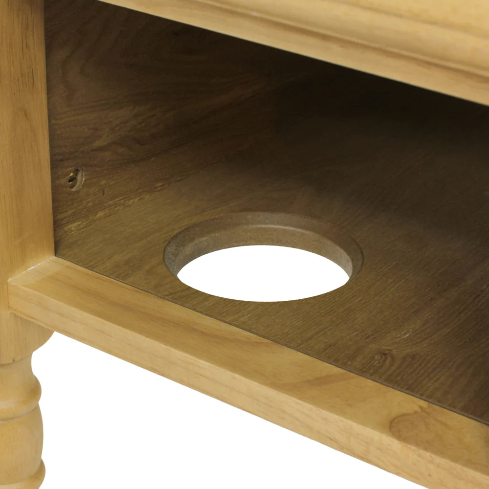 天板下にはドライヤーを収納したり電源コードを通せる穴が備えられています。これにより天井から配線される電源コードが、表面に現れることなく天板下の配線口から取り出せるようになりました。※配線口にはコードの緩衝材は付いておりませんので、業者の方にご相談の上、必要に応じてお取り付けいただくことを推奨しております。(オプションで天板横にコンセントプラグを取り付け可能)